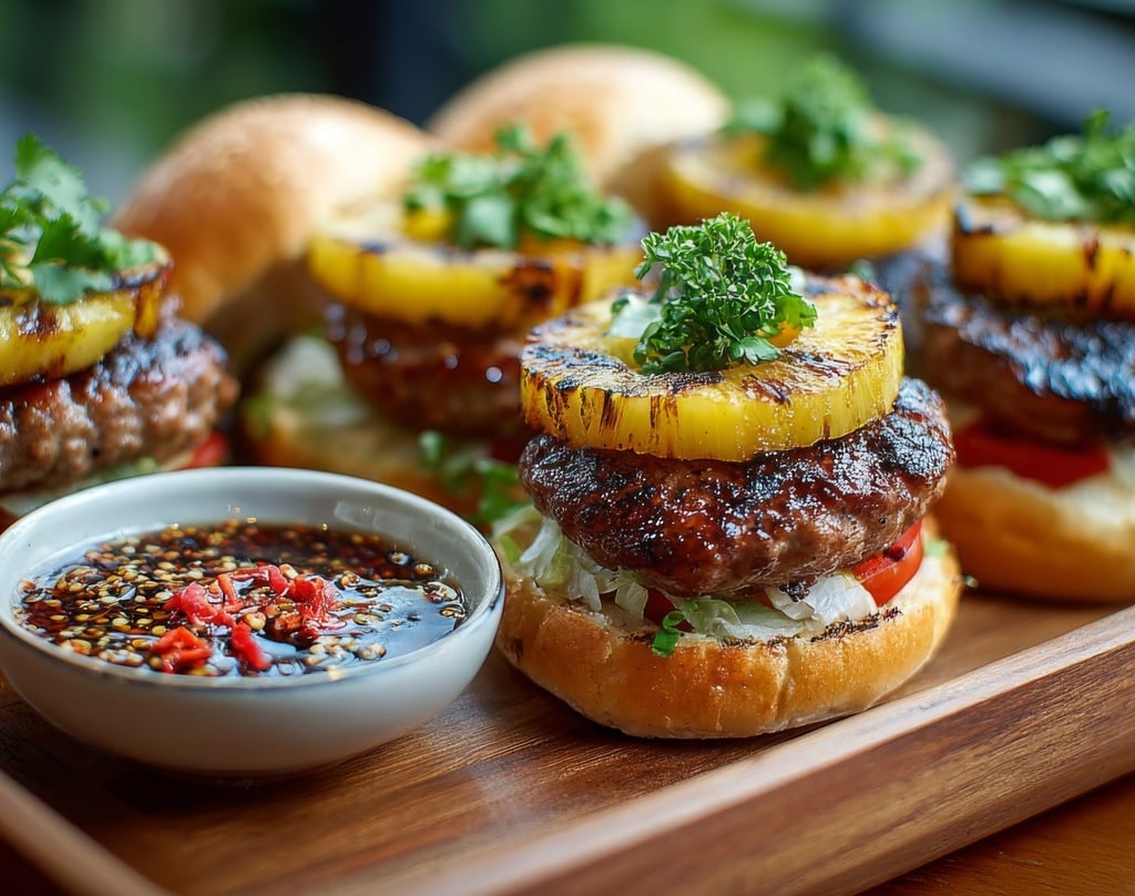 Juicy teriyaki-glazed patties topped with caramelized pineapple for that perfect salty-sweet tropical kick. These sliders are a major crowd-pleaser — ideal for summer bar nights, backyard parties, and cocktail hour snacks with island energy.