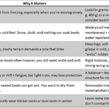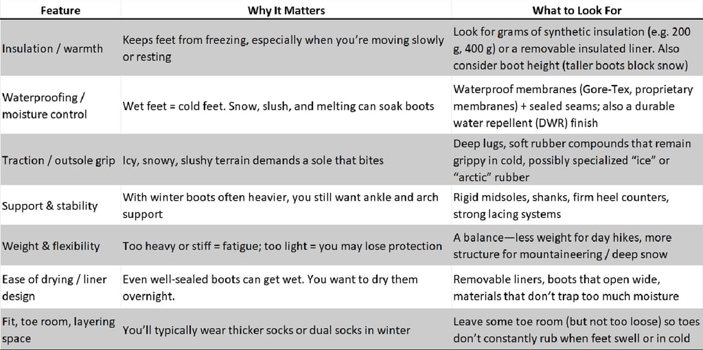Before jumping into models, let’s review the key features you should look for when choosing a winter hiking boot. Your ideal pair is the one that balances all or most of these, suited to the the conditions you expect to face.